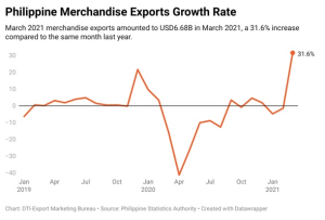 MANILA – Supported by the global economic recovery arising from the ongoing Covid-19 vaccinations, Philippine merchandise exports in March 2021 rebounded strongly and jumped by 31.6% compared to the same month last year. At USD6.68B, March 2021 exports were even higher than the USD6.03B earned in March 2019, before...