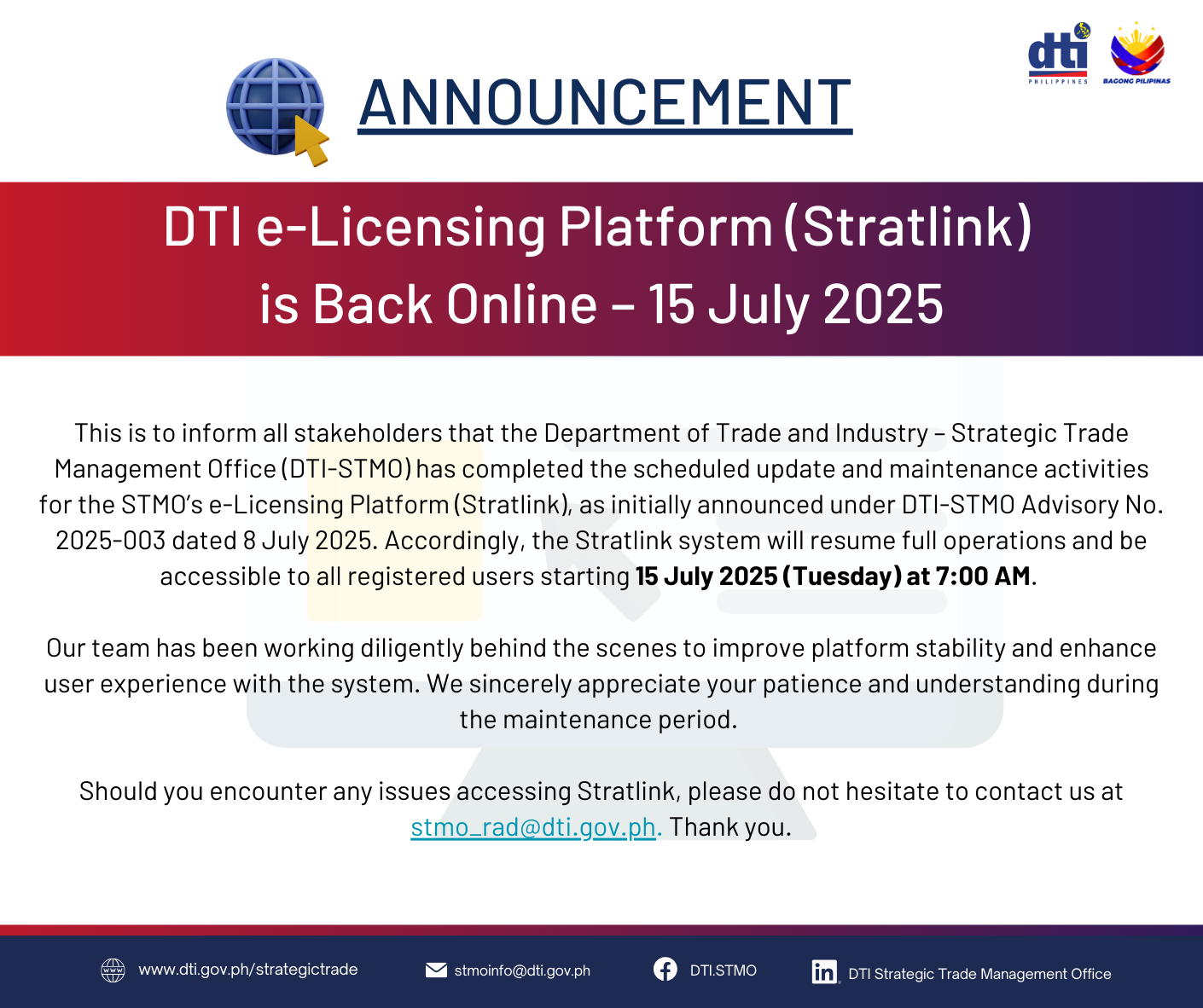 The Department of Trade and Industry – Strategic Trade Management Office (DTI-STMO) wishes to inform the public the following updates on the United Sanctions Security Council (UNSC) Consolidated Sanctions List and implementation of the Strategic Trade Management Act: