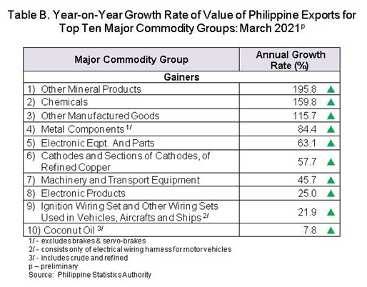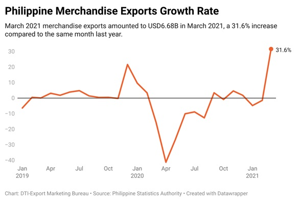 MANILA – Supported by the global economic recovery arising from the ongoing Covid-19 vaccinations, Philippine merchandise exports in March 2021 rebounded strongly and jumped by 31.6% compared to the same month last year. At USD6.68B, March 2021 exports were even higher than the USD6.03B earned in March 2019, before the COVID-19 pandemic.