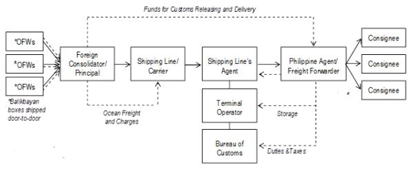 Overseas Filipinos usually engage the services of a foreign consolidator/principal sea freight forwarder in sending their balikbayan boxes to their relatives in the Philippines. The foreign consolidators collect door-to-door charges from the OFWs as senders. These charges includes the fees for a shipping line/carrier, terminal storage, duties and charges, and the accredited Philippine agent/local freight forwarder.