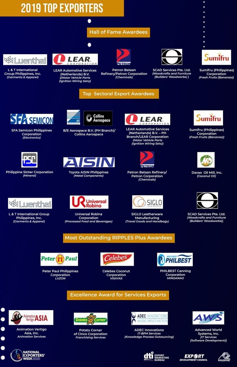 The Top Exporter Award is given to companies which have achieved the highest value of a 1-year (2019) stellar record of export revenue performance including the export performance for the last two (2) consecutive years from their respective sectors based on data provided by the Philippine Statistics Authority (PSA). They have significantly contributed to the export performance of the country, working together with Philippine small and medium enterprises (SMEs) and remaining committed as major partners for the creation of jobs and investments in the Philippines.