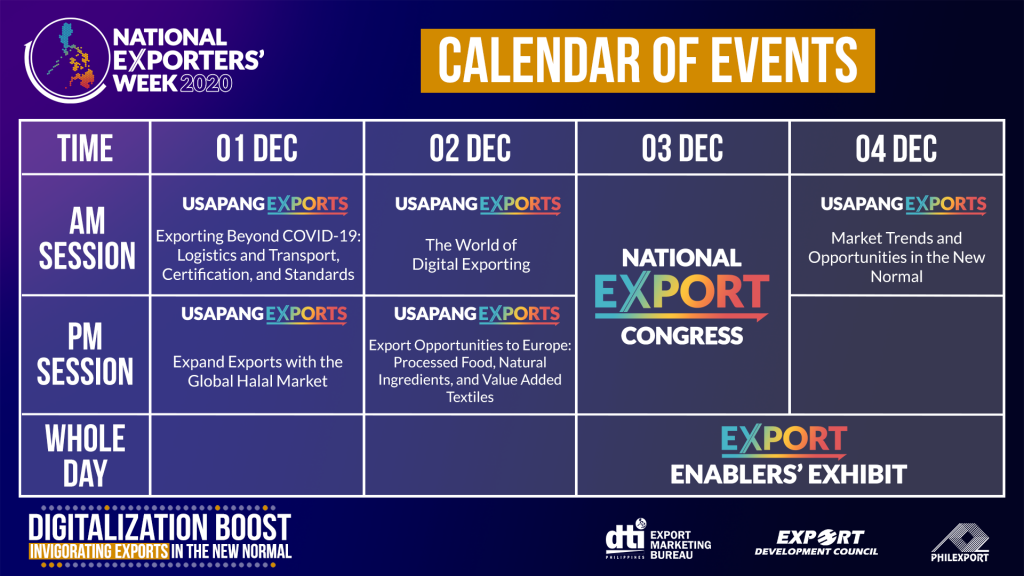 The National Exporter’s Week (NEW) will kick off on the first week of December with the conduct of Usapang Exports, a four-day online session that will take a closer look at exporting during and after COVID-19.