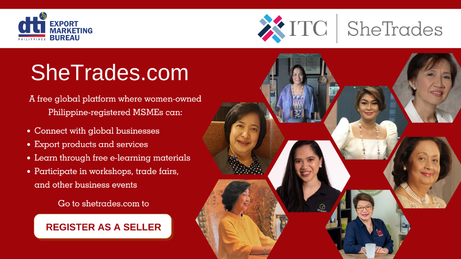 - Register at www.shetrades.com and visit http://tradeline.dti.gov.ph/web/tradeline-portal/shetrades