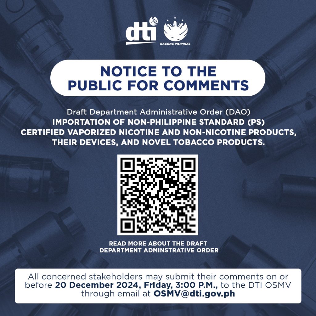 The Department of Trade and Industry (DTI) invites stakeholders to provide comments on the DRAFT DEPARTMENT ADMINISTRATIVE ORDER (DAO) on IMPORTATION OF NON-PHILIPPINE STANDARD (PS) CERTIFIED VAPORIZED NICOTINE AND NON-NICOTINE PRODUCTS, THEIR DEVICES, AND NOVEL TOBACCO PRODUCTS.