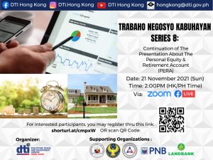Hong Kong – The Philippine Trade and Investment Center Hong Kong (PTIC-HK) conducted its 8th Trabaho Negosyo Kabuhayan (TNK) webinar in 2021 together with the Philippine Consulate General in Hong Kong (PCGHK), Overseas Workers Welfare Administration (OWWA), Bangko ng Sentral Pilipinas (BSP), Philippine National Bank (PNB) and the Land Bank…