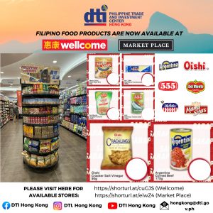 Hong Kong – The Department of Trade and Industry through the Philippine Trade and Investment Center – Hong Kong (PTIC-HK) is pleased to announce that some Filipino food products are now available in the Hong Kong-based supermarket chains namely: Wellcome and Market Place under the DFI Group starting 6 October…