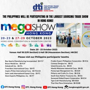 Hong Kong – The Philippine Trade and Investment Center – Hong Kong (PTIC-HK) invites overseas Filipinos and buyers from Hong Kong and Mainland China to support the 17 participating Filipino companies in the Mega Show 2023 on 20 to 23 October 2023 at the Hong Kong Convention and Exhibition Centre.…