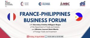 April 10, 2025The Department of Trade and Industry (DTI), through the Philippine Trade and Investment Center in Paris (PTIC-Paris) in partnership with the French Chamber of Commerce and Industry in the Philippines (CCI-FP), Makati Business Club (MBC), and the French Embassy in Manila, is co-organizing a France-Philippines Business Forum in Fairmont Hotel…Read More -