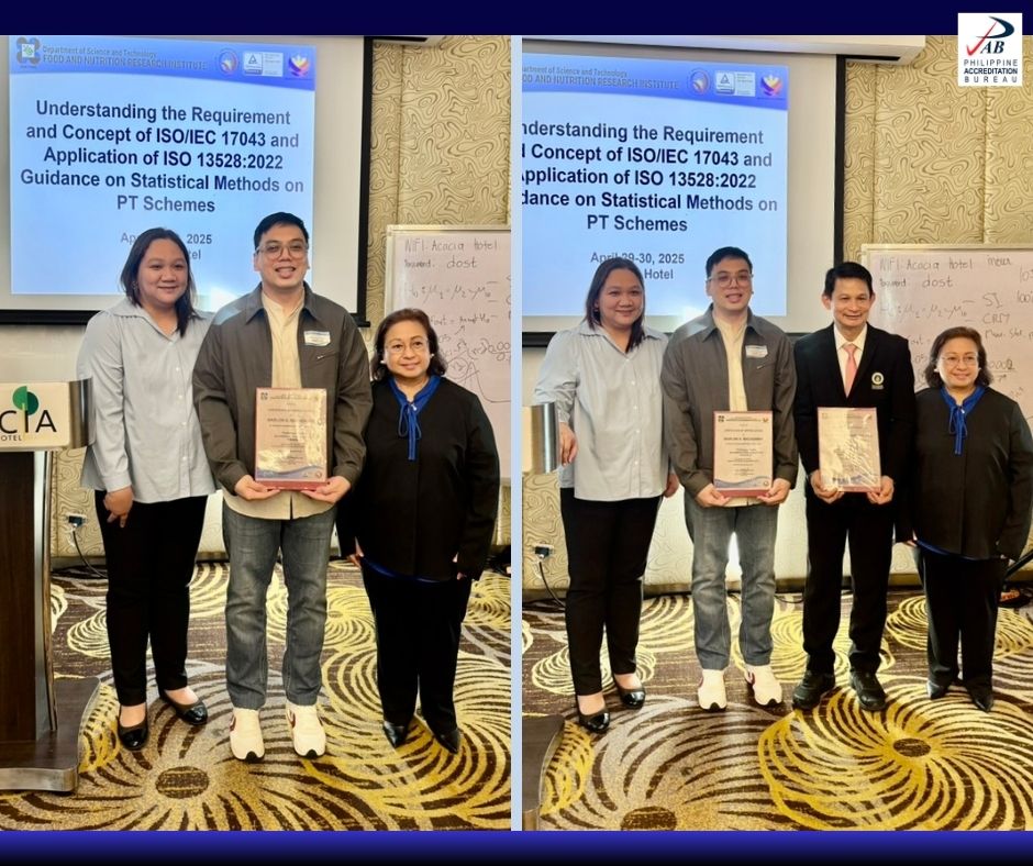 The Department of Trade and Industry-Philippine Accreditation Bureau (DTI-PAB) took part in a two-day training workshop organized by the Department of Science and Technology-Food and Nutrition Research Institute (DOST-FNRI) on April 29-30, 2025. The event, titled “Understanding the Requirements and Concepts of ISO/IEC 17043:2023 and Application of ISO 13528:2022 Guidance on Statistical Methods on PT Schemes,” was held at the Acacia Hotel Manila, Muntinlupa City.