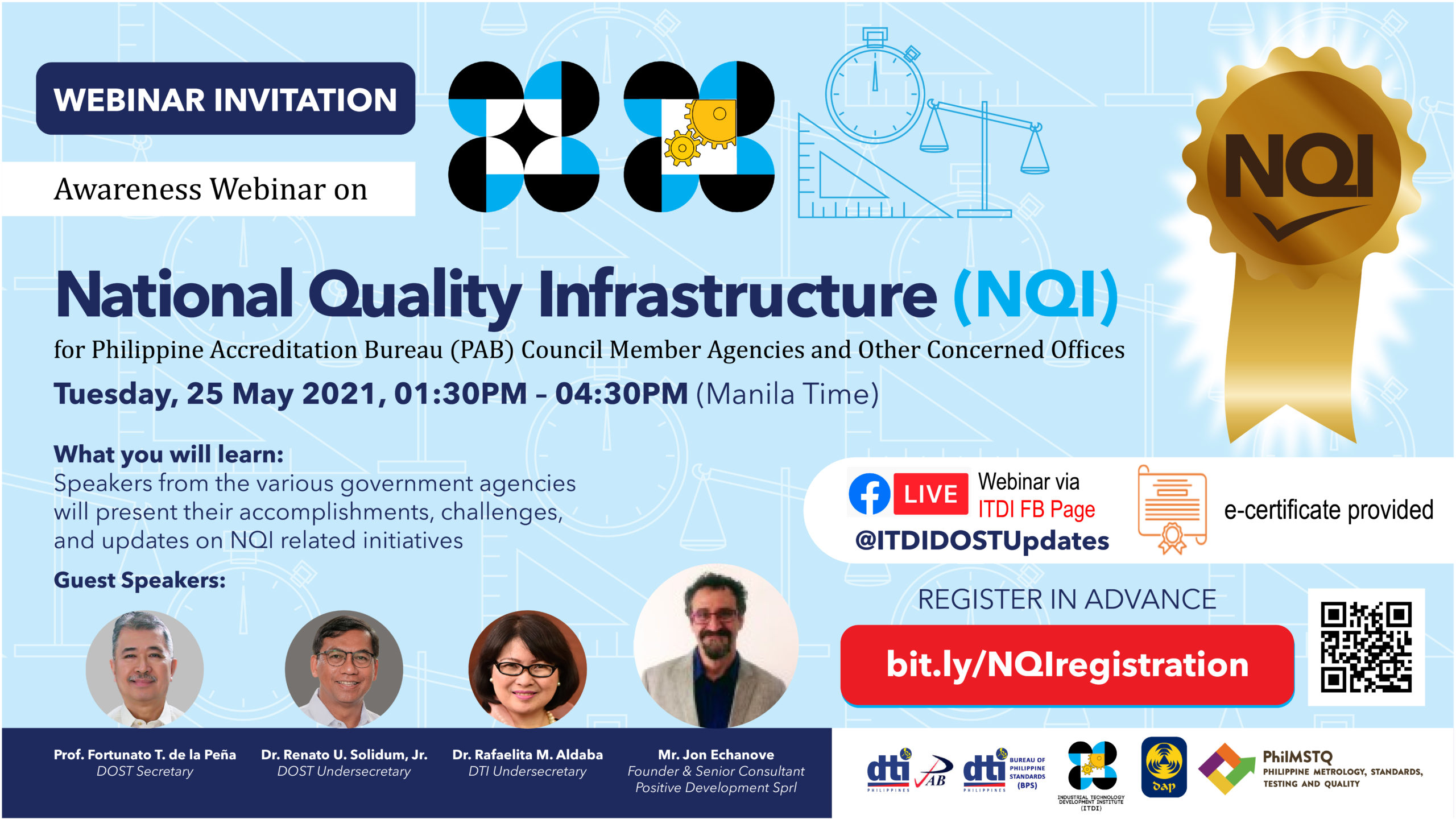 The Philippine Accreditation Bureau is pleased to share the invitation to attend the Department of Science and Technology – Industrial Technology Development Institute’s activity entitled, “Awareness Webinar on the National Quality Infrastructure for PAB Council Members and Other Concerned Government Agencies” on 25 May 2021 at 01:30 PM– 04:30 PM via videoconferencing. This webinar aims to gather the concerned agencies to provide updates on their initiatives and have a common understanding of the National Quality Infrastructure (NQI).