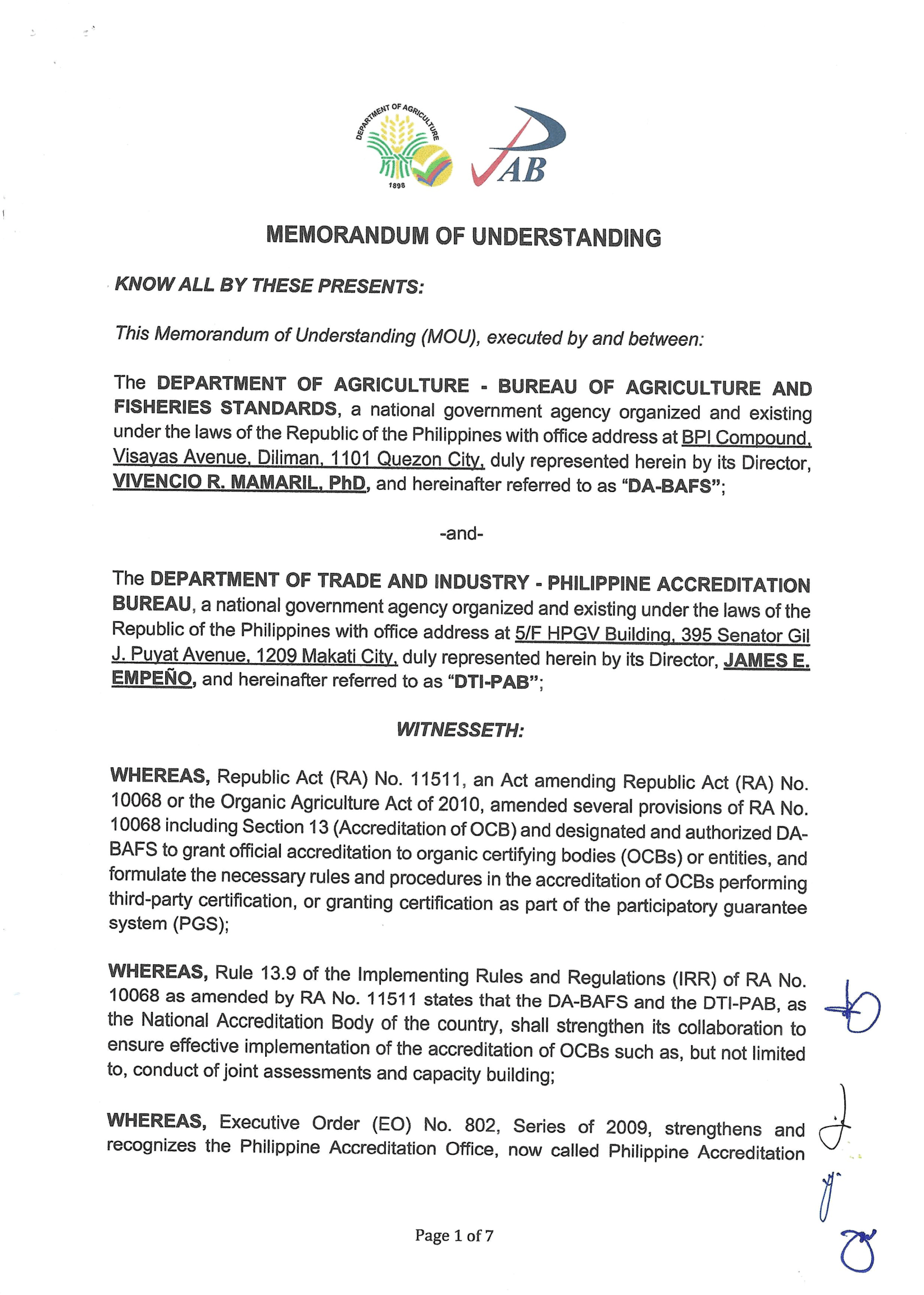 In line with the effective implementation of the amended Organic Agriculture Law and its Implementing Rules and Regulations (IRR), the Department of Trade and Industry – Philippine Accreditation Bureau (DTI-PAB) and the Department of Agriculture – Bureau of Agriculture and Fisheries Standards (DA-BAFS) signed the updated Memorandum of Understanding (MOU) with the objective of further strengthening the collaboration of the two agencies in the implementation of Organic Certification Body (OCB) accreditation.