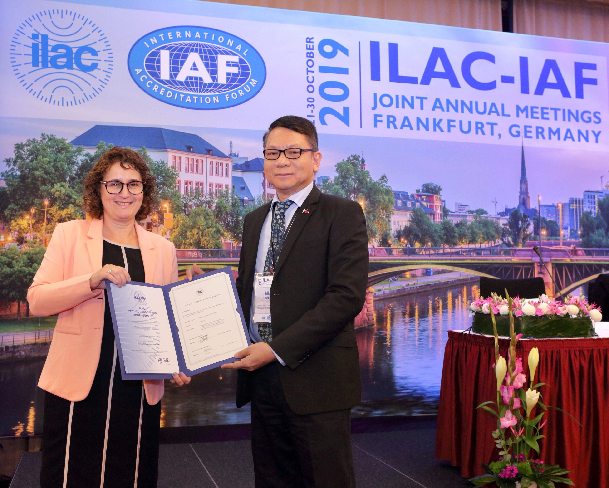 The DTI-Philippine Accreditation Bureau (PAB) formally received the certificate of International Laboratory Accreditation Cooperation Mutual Recognition Arrangement (ILAC-MRA) after achieving signatory status for its accreditation schemes for medical testing and inspection. The result of the peer evaluation extending the MRA for these schemes was announced on 29 October 2019 when DTI-PAB attended the 2019 International Accreditation Forum (IAF) and International Laboratory Accreditation Cooperation (ILAC) Joint Annual Meetings in Frankfurt, Germany.