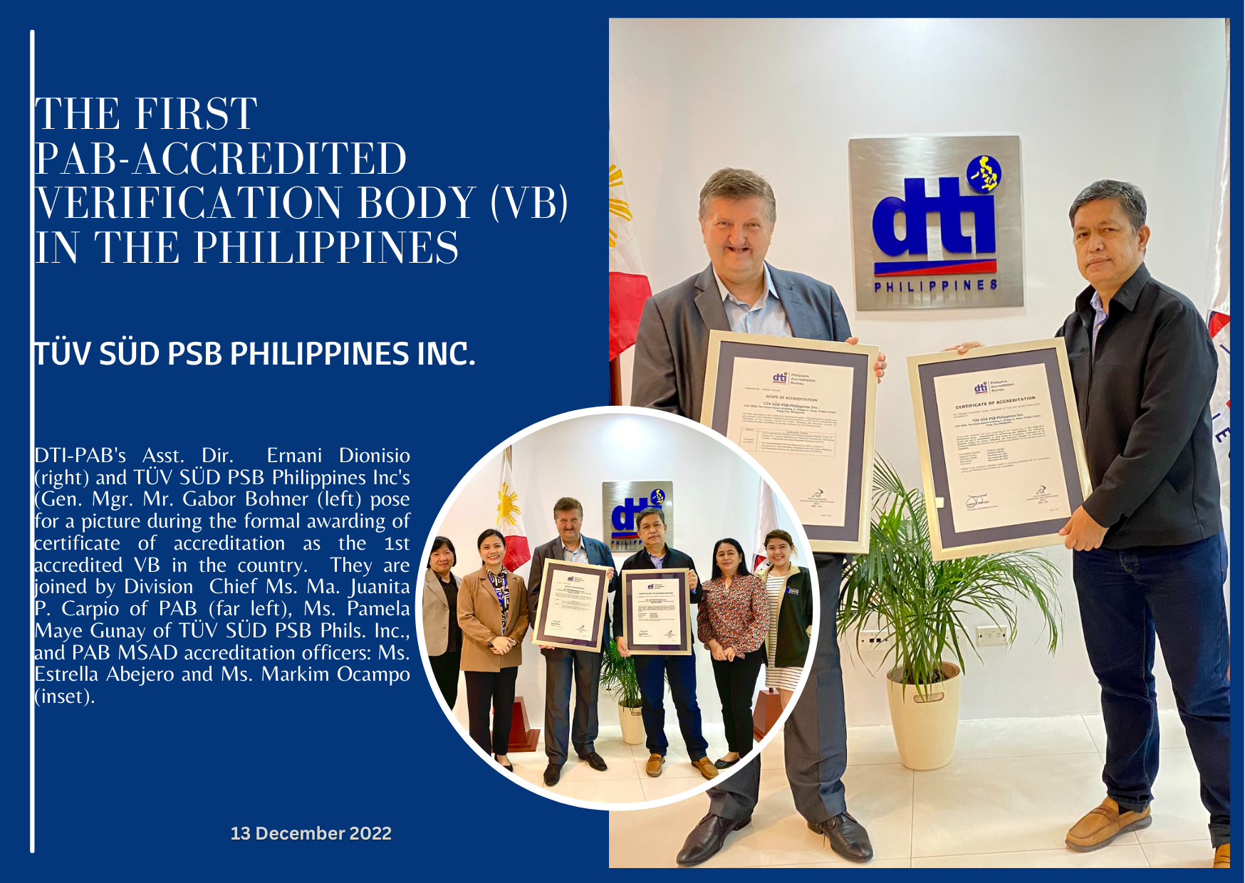 On December 13, 2022, PAB formally awarded the accreditation certificate of TÜV SÜD PSB Philippines Inc. — the first PAB-accredited Verification Body in the country.