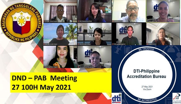 The virtual meeting held on May 27, 2021 via Zoom were headed by DTI-CIG Undersecretary Rafaelita M. Aldaba and DTI-PAB Director James E. Empeño and attended by other DTI-PAB personnel. DND representative Mr. David R. LCruz attended the meeting on behalf of Undersecretary Arnel M. Duco and other key officials. For more information about DTI-PAB and its services, please visit www.dti.gov.ph/pab.