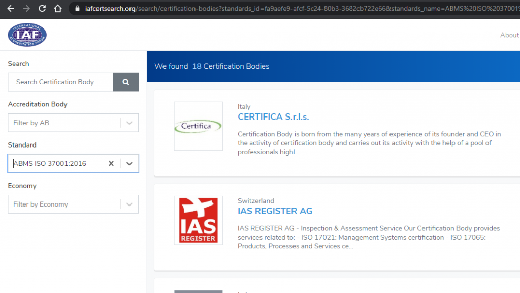 Aside from verifying the authenticity of certificates, IAF CertSearch is also a good source of information for research purposes. This was proven when an organization requested from PAB, a list of certification bodies which are accredited to certify for ISO 37001:2016 (Anti-bribery management system), a fairly new standard in the Philippines. Specifically, they wanted to know the number of countries with companies granted with certification based on this standard. They also would want to know if a certain company is the first company to be certified with the standard in the Philippines. PAB records only contains data of its accredited CBs. The IAF CertSearch website proved very helpful in generating the required information. It has a functionality that allows you to search for list of certification bodies globally. Filters like the CBs’ Accreditation Body, Standard they certify and Location, helped a great deal in identifying which CBs certify for a certain standard. All these information would allow the requester to validate the information that the company cited in their query, is indeed the first company in the Philippines to be certified with ISO ISO 37001:2016.