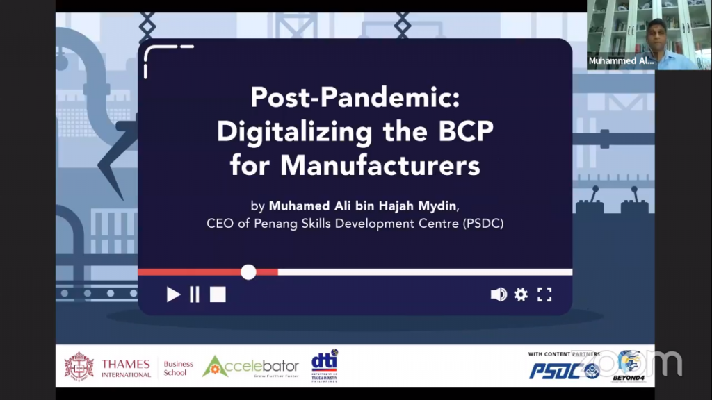 The shift to virtual rooms is the culmination of the past week’s efforts to prevent COVID-19 from entering establishments and spreading to local communities during the enhanced community quarantine (ECQ). Embracing the advantages of technology, the Department of Trade and Industry – Philippine Accreditation Bureau grabbed the opportunity of the free online seminar entitled “Post Pandemic: Digitalizing the BCP for Manufacturers” conducted on April 03, 2020, 10:00am Philippine time and sponsored by Thames International Business School in partnership with Accelebator Singapore, Penang Skills Development Centre (PSDC) Malaysia and Beyond4Tech Malaysia.