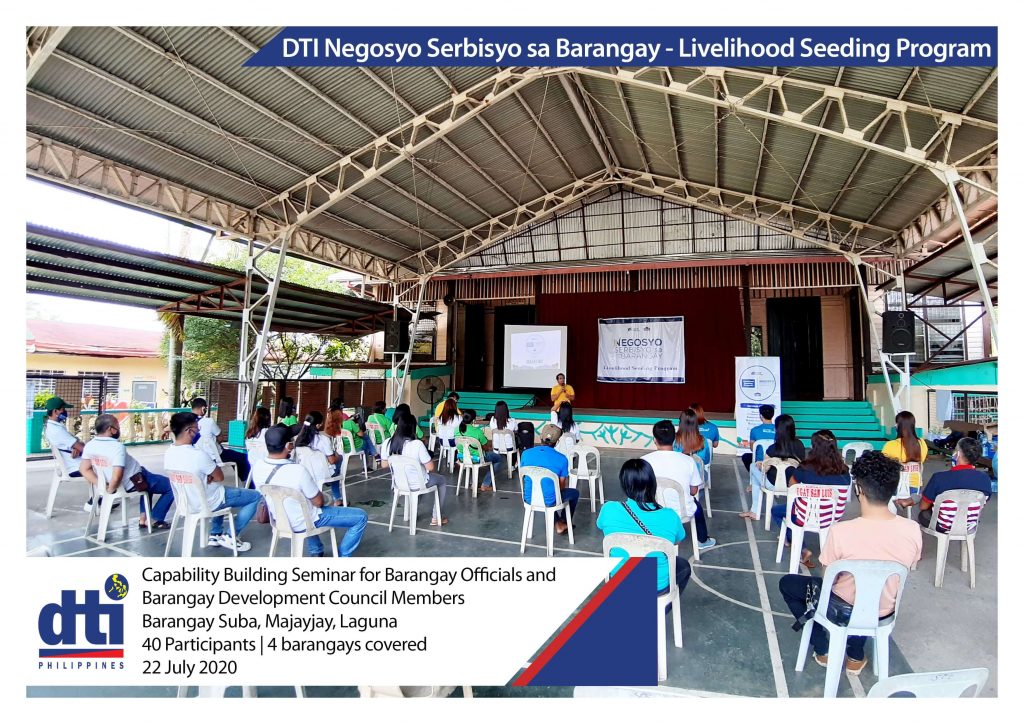 Majayjay, Laguna — The Department of Trade and Industry Laguna Provincial Office conducted the 2nd run of the Negosyo Serbisyo sa Barangay (NSB) – Livelihood Seeding Program (LSP) at the Covered Court, Suba Elementary School, Brgy. Suba, Majayjay, Laguna, on July 22, 2020. A capability building seminar for 2nd batch of Barangay Officials and Barangay Development Council Members for the other four barangays such as Talortor, Coralao, Pangil, and Panglan was facilitated and participated by 40 attendees (including 4 Senior Citizens). A total of 375 NSB-LSP information kits (information materials and brochures on MSME Development and Consumer Protection) were provided and distributed.