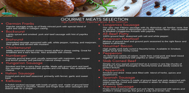 Currently, Shepherd’s Deli’s gourmet meat selection includes longaniza, German franks, gourmet bacon, pepperoni, slab corned beef, Hungarian sausage, all-beef patty, American meatloaf, bockwurst, bratwurst, chickenwurst, Italian sausage, kielbasa, pepperstick, Spanish sausage, nurnberger, and Vienna sausage.