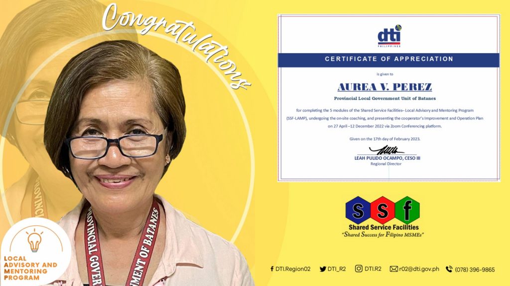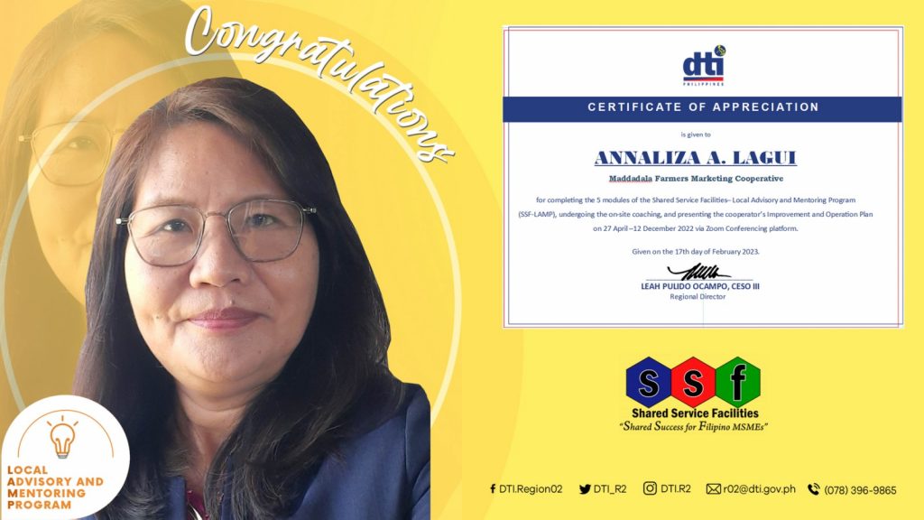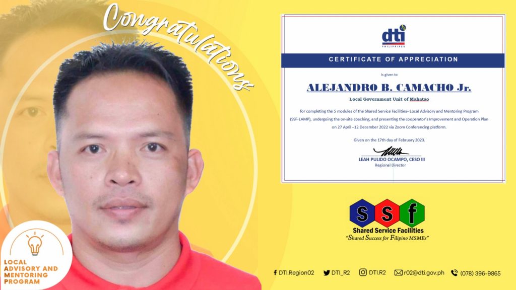 CAGAYAN VALLEY — The Department of Trade and Industry Region 2 (DTI R2) led the celebration of the success of the 12 mentees from Cagayan Valley’s various provinces on their graduation on February 17, 2023 from the DTI’s Shared Service Facility (SSF) Local Advisory and Mentoring Program (LAMP), the first mentoring and advisory session of the entire DTI’s SSF Project focusing on its beneficiaries.