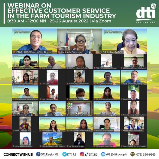 The Department of Trade and Industry (DTI) Region 2, in collaboration with the International School of Sustainable Tourism (ISST), successfully conducted Farm Tourism 110: Effective Customer Service on 25-26 August 2022, 8:30-12nn, via Zoom.