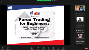 February 21, 2023PAKIL, LAGUNA — The Department of Trade and Industry – Laguna Provincial Office (DTI-Laguna), through its Negosyo Center Pakil, conducted a webinar on Forex Trading for Beginners: What You Need to Know and How Does It Work last 16 February 2023 via the online conferencing platform Zoom. The 2-hour webinar…Read More -