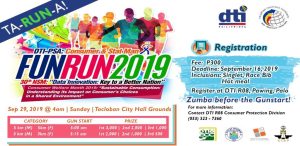 September 10, 2019Ta-RUN-a! DTI in partnership with the Philippine Statistics Office, DTI 8 ECC, City of Tacloban, IPO Phil Region 8 Satellite Office, and CIAP Region 8 Satellite Office, brings you the DTI-PSA: Consumer and Stat Man FUNRUN 2019 on 29 September 2019, 4:00 AM at the Tacloban CIty Hall Grounds.Read More -
