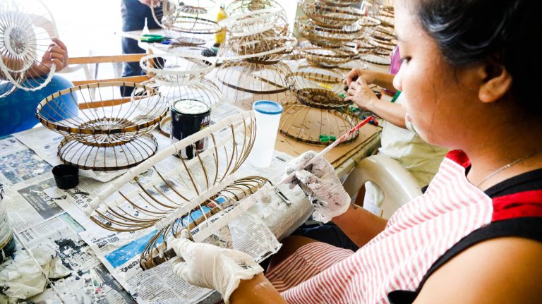 CEO Lolita crafts sustainable designer lamps by merging handmade paper with indigenous materials such as abaca fiber, cogon grass, bamboo sticks, rattan vines, and other plant-based materials.