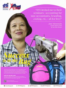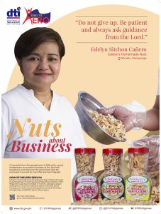 “DTI helped me to enhance my product labeling to make it even more attractive to buyers. They provided trainings on how to display our products, how to win buyers, and how to compute for pricing. DTI’s trade fairs also became a great venue for promoting our products,” said Evelyn.